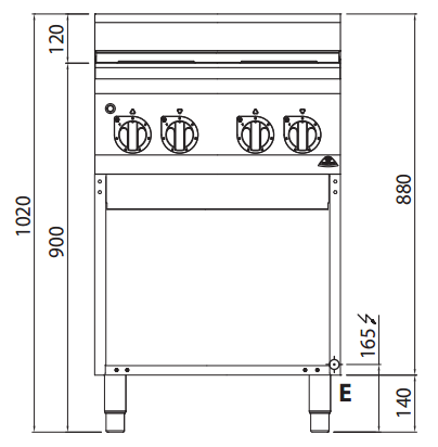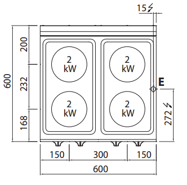 Worktop and front panels in AISI 304 stainless steel. Worktop molded in a single, watertight piece. Cast iron plates with safety thermostat and 6-position selector that activates 6 different concentric power zones. Voltage and work control lights. Adjustable feet.