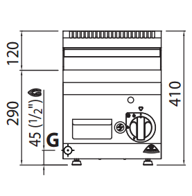 Worktop in AISI 304 stainless steel. Large surface tubular burners with self-stabilised flame for greater uniformity of heat distribution. Adjustment of the power supplied via continuously operating tap. Pilot flame and thermocouple safety valve. Piezoelectric ignition with silicone protection. Maximum temperature over 300°C. RIBBED plate in satin steel with flush splashguard. Slightly inclined cooking surface with large drain hole and conveyor into a special liquid-tight container.