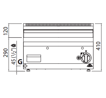 Worktop in AISI 304 stainless steel. Large surface tubular burners with self-stabilised flame for greater uniformity of heat distribution. Adjustment of the power supplied via continuously operating tap. Pilot flame and thermocouple safety valve. Piezoelectric ignition with silicone protection. Maximum temperature over 300°C. RIBBED plate in satin steel with flush splashguard. Slightly inclined cooking surface with large drain hole and conveyor into a special liquid-tight container.