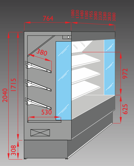Vulcano model refrigerated wall display. Designed for displaying and storing fruit and vegetables. Designed for markets and fruit and vegetable shops. Different versions available with different lengths depending on needs.