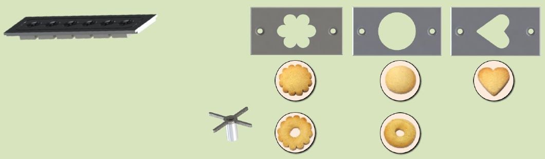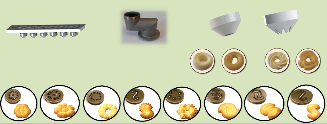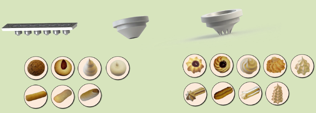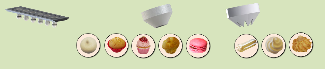 - STR6-400: Rotary mold 6 outlets for consistent doughs + 6 smooth nozzles diameter 10mm