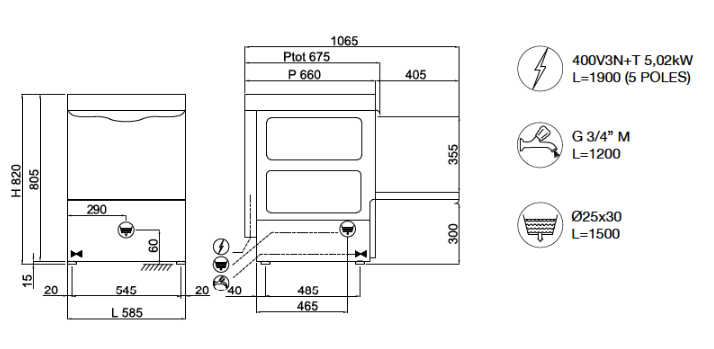 2nd case : If the drain is positioned on the wall (more than 5 cm from the floor), you must purchase the drain pump in addition to the standard machine. You can do this at the same time as purchasing the machine (in this case it will be installed directly and at no cost), or you can also do it at a later time (after purchasing the main machine). This is possible since all the machines are designed for the installation of the loading pump.