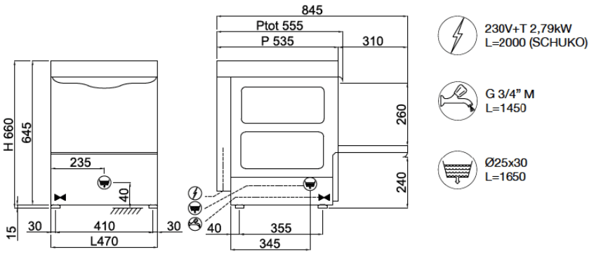 2nd case : If the drain is positioned on the wall (more than 5 cm from the floor), you must purchase the drain pump in addition to the standard machine. You can do this at the same time as purchasing the machine (in this case it will be installed directly and at no cost), or you can also do it at a later time (after purchasing the main machine). This is possible since all the machines are designed for the installation of the loading pump.