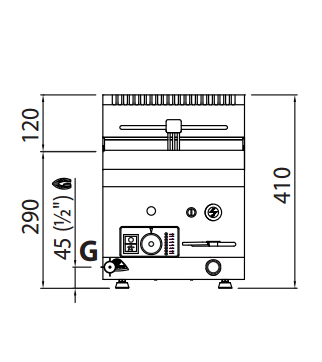 Fond de cuve en acier inoxydable AISI 304. Cuve arrondie avec une large zone froide pour récupérer les résidus alimentaires. Brûleurs tubulaires en nid d'abeille. Le système de friture, préservant les caractéristiques organoleptiques de l'huile, permet une cuisson saine tout en limitant le nombre de vidanges, générant ainsi des économies significatives. Système de sécurité avec vanne thermocouple et thermostat de sécurité, veilleuse protégée. Réglage de la température sur 8 positions de 110 à 190 °C. Production horaire maximale estimée à 9,6 kg. Temps de friture moyen de 5 minutes. Préchauffage de 15 minutes (de 20 à 190 °C). Allumage piézoélectrique avec protection en silicone.