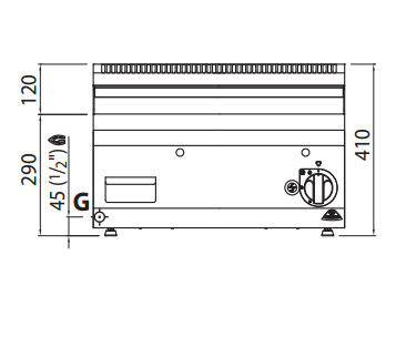 Plan de travail en acier inoxydable AISI 304. Brûleurs tubulaires de grande surface avec flamme auto-stabilisante pour une répartition uniforme de la chaleur. Réglage de la puissance par robinet à fonctionnement continu. Veilleuse et soupape de sécurité à thermocouple. Allumage piézoélectrique avec protection en silicone.