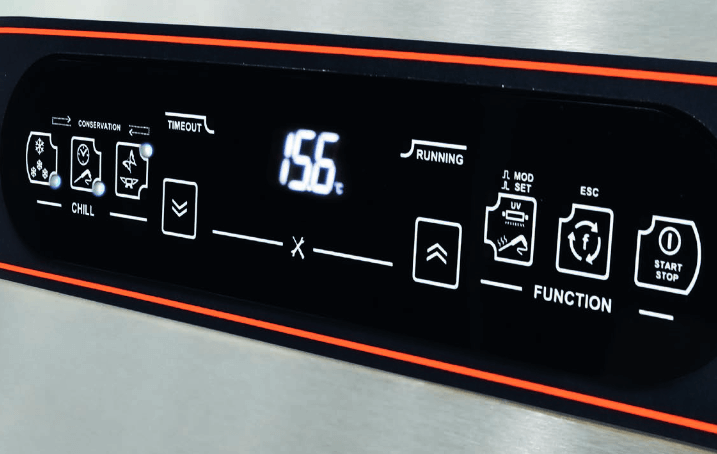 Cellule de refroidissement rapide en acier inoxydable avec panneau de commande numérique et capteurs tactiles, pour 5 plateaux GN 1/1 ou 60x40 cm.