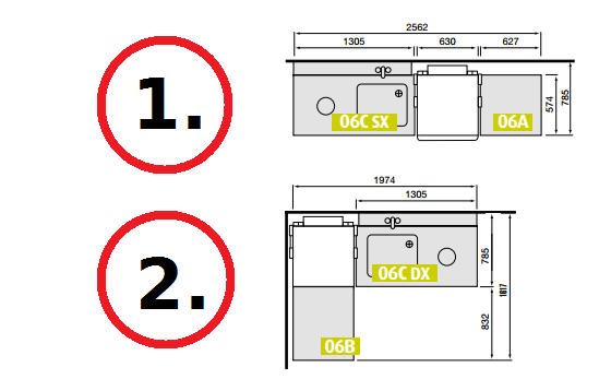 Linea di lavaggio completa di: lavastoviglie a cappotta, lavello con vasca e piano con foro sbarazzo, e tavolo uscita cesto. Ordinabile in due versioni: