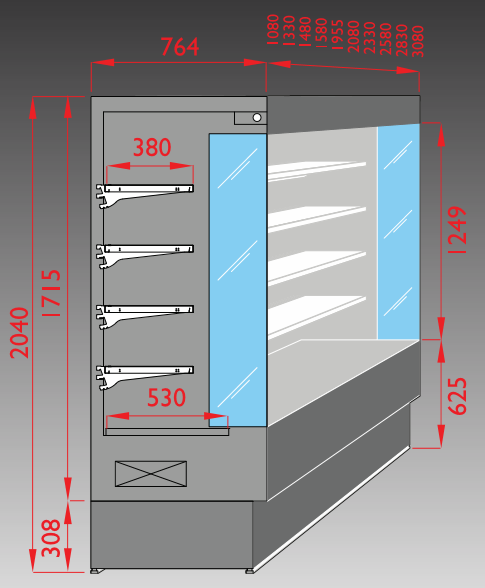 Espositore murale refrigerato modello Vulcano con profondità 80 cm. Ideato per esporre cibi freschi preconfezionati che necessitano di essere conservati a temperature adeguate come salumi, latticini e bibite. Pensati per market, macellerie e gastronomie. Disponibili diverse versioni con lunghezze differenti a seconda delle esigenze.
