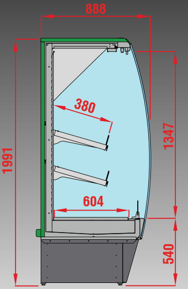 Espositore refrigerato murale a sviluppo verticale per l’esposizione e vendita a libero servizio di salumi e latticini, frutta e verdura, bevande. Facilmente installabile, è disponibile sia con gruppo incorporato dotato di sistema di recupero e rievaporazione automatica dell’acqua di condensa che in versione per allacciamento a compressore remoto. Viene usualmente fornito completo di fiancate, è però canalizzabile per l’allestimento di composizione con lunghezze diverse. I prodotti esposti vengono sempre mantenuti alla temperatura ideale grazie al flusso di aria refrigerata garantita da un impianto frigorifero ben dimensionato; la temperatura viene regolata tramite un termostato elettronico.