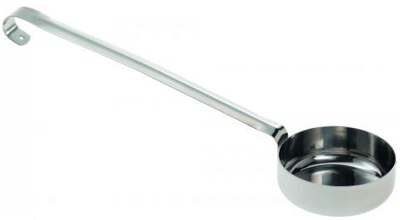 Mestolo in acciaio inox con fondo piatto per distribuire la salsa di pomodoro uniformemente.