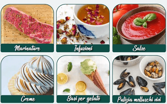 - Ciclo speciale DEG: tramite desaerazione ad impulsi manuali è possibile realizzare preparazioni come marinature, infusioni, salse, creme, basi per gelato e pulizia molluschi vivi.