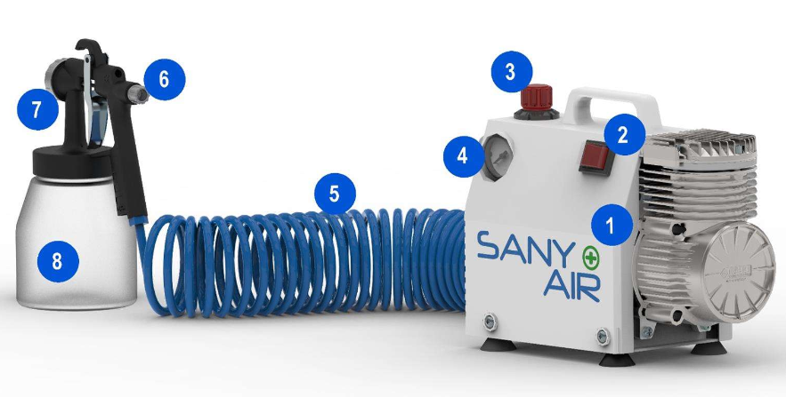 Grazie al nebulizzatore di liquidi igienizzanti è possibile disinfettare ogni tipo di ambiente e superficie. Prodotto "Made in Italy" ad alta efficienza in grado di lavorare in continuo molte ore senza nessuna manutenzione. Compressore senza olio a bassa pressione dotato di pistola in pressione che riesce con pochissima aria a nebulizzare il prodotto scelto.