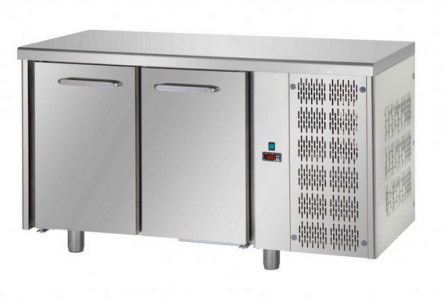 Tavolo e piano di lavoro interamente in acciaio INOX. 2 Porte con chiusura automatica e guarnizione magnetica. Unità refrigerante interna.